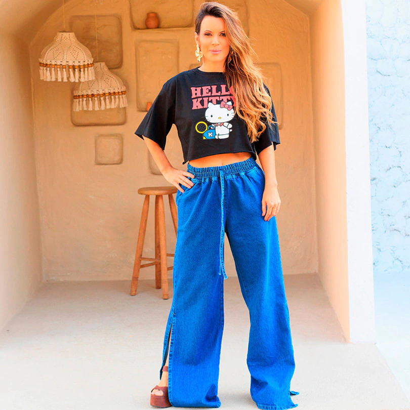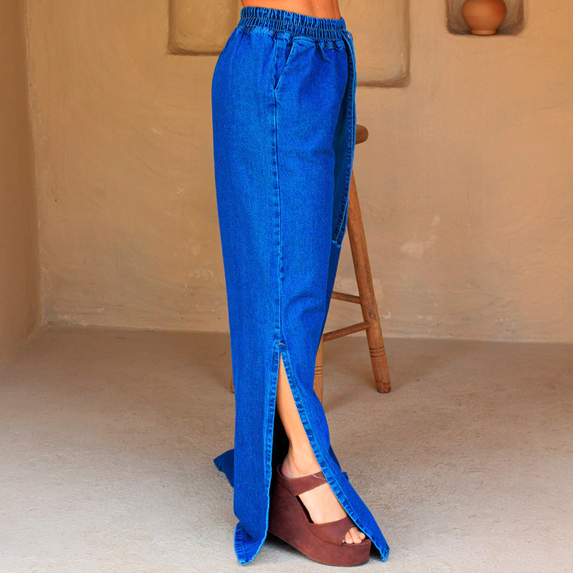 Calça pantalona jeans em lavagem média, com elástico na cintura para maior conforto. Possui fenda lateral que traz um toque moderno e estiloso ao look. Versátil, transita facilmente entre um passeio descontraído, o ambiente de trabalho ou um happy hour com os amigos. Com excelente custo-benefício, é uma peça durável e atemporal. Um verdadeiro item Tenqtê no guarda-roupa, que você vai usar por muitos anos e em diversas ocasiões.