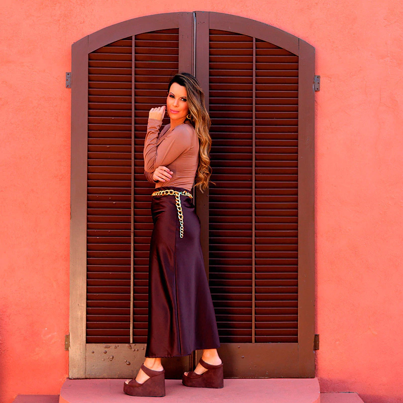 Confeccionada em cetim, esta saia midi evasê traz um caimento impecável e movimento delicado na barra, reforçando sua sofisticação.