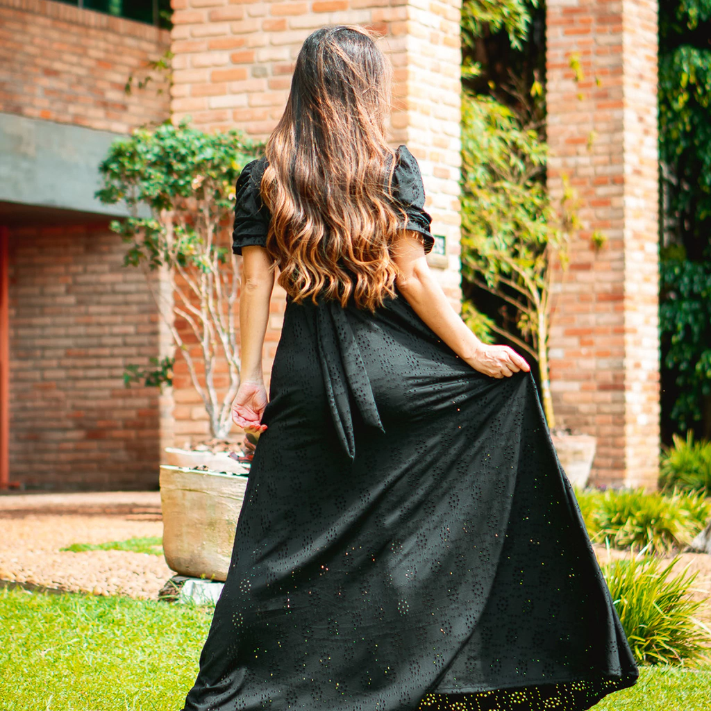 Manga curta, ligeiramente bufante para dá uma estruturada no vestido.