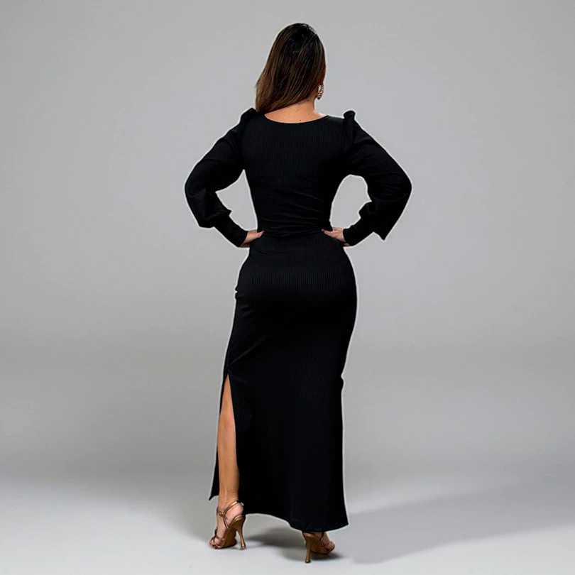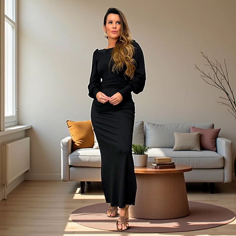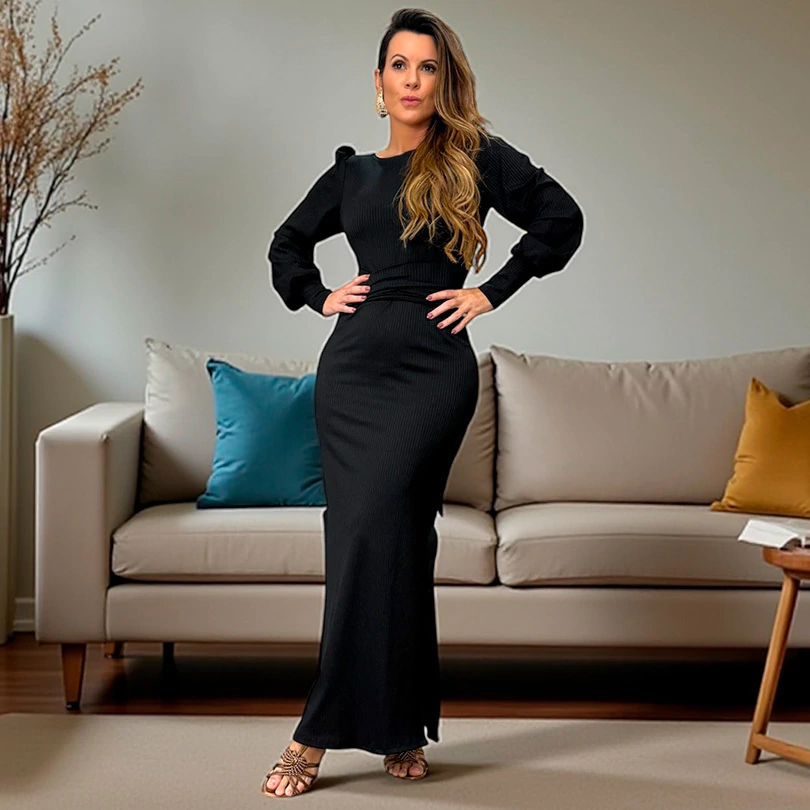 Vestido longo confeccionado em malha canelada sintética, com caimento sofisticado e confortável.
