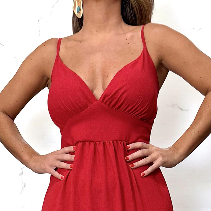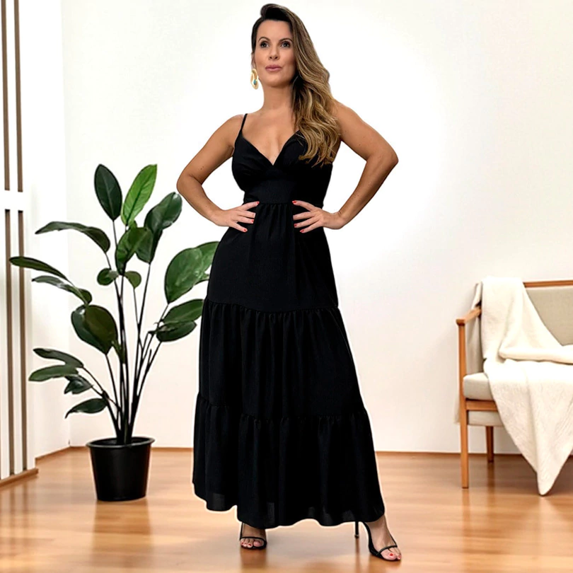 Vestido longo confeccionado no tecido duna, com alcinhas finas e bojo embutido, garantindo sustentação e conforto.