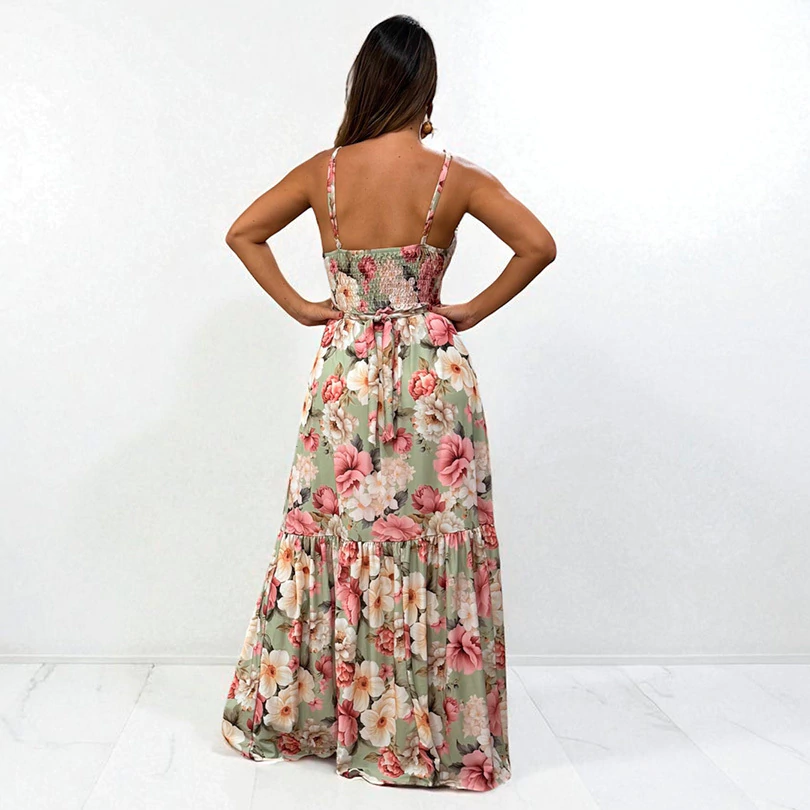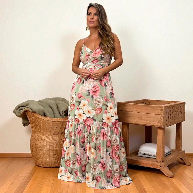Vestido longo com estampa floral delicada, confeccionado em tecido Mônaco, leve e fluido, ideal para eventos e datas especiais.