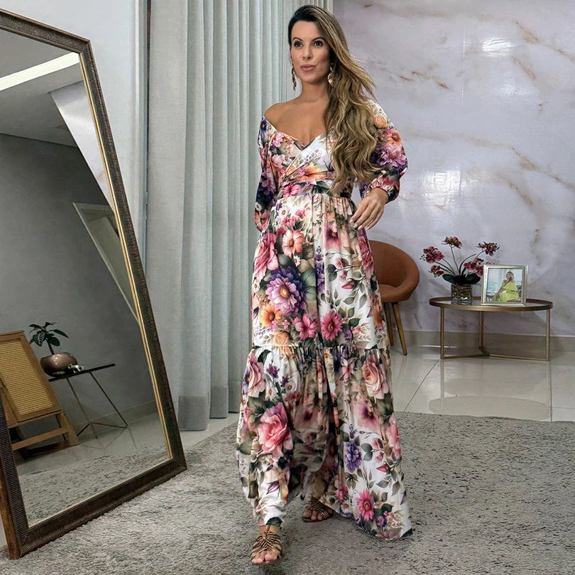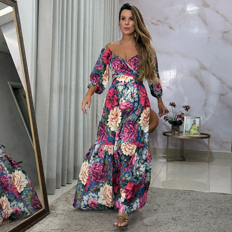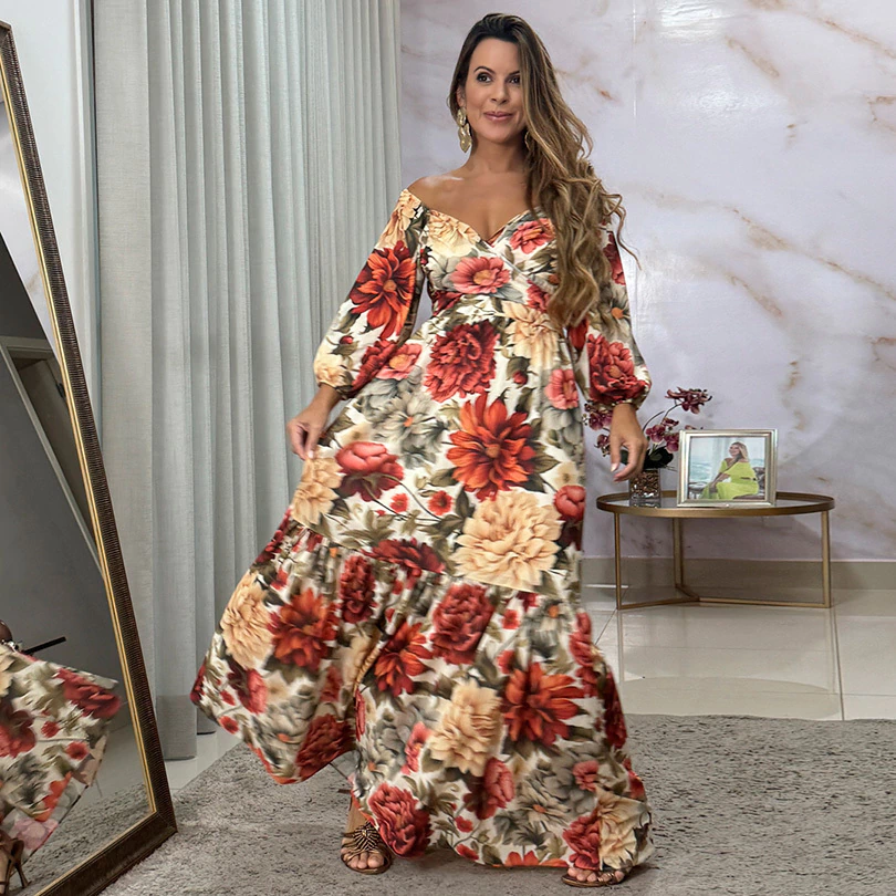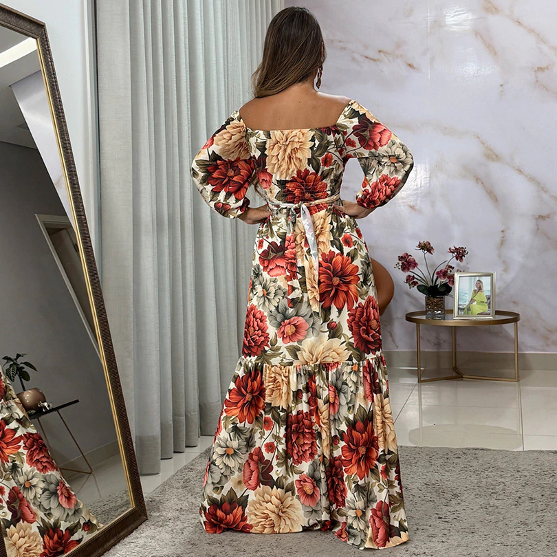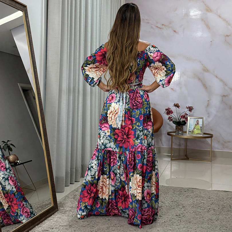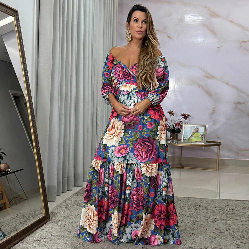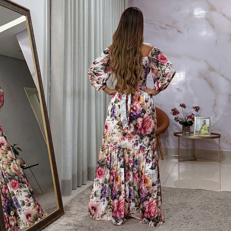 Vestido longo com estampa floral delicada, confeccionado em tecido Mônaco, leve e fluido, ideal para eventos e datas especiais.