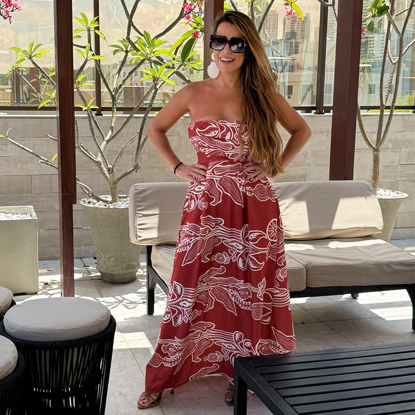 Vestido Longo Tomara que Caia em Viscose Encerada com Amarração nas Costas estampa vermelha - Magda