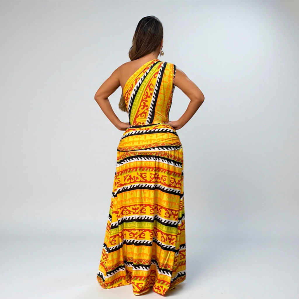 Vestido longo de um ombro só, com uma estampa maravilhosa que transforma qualquer look.