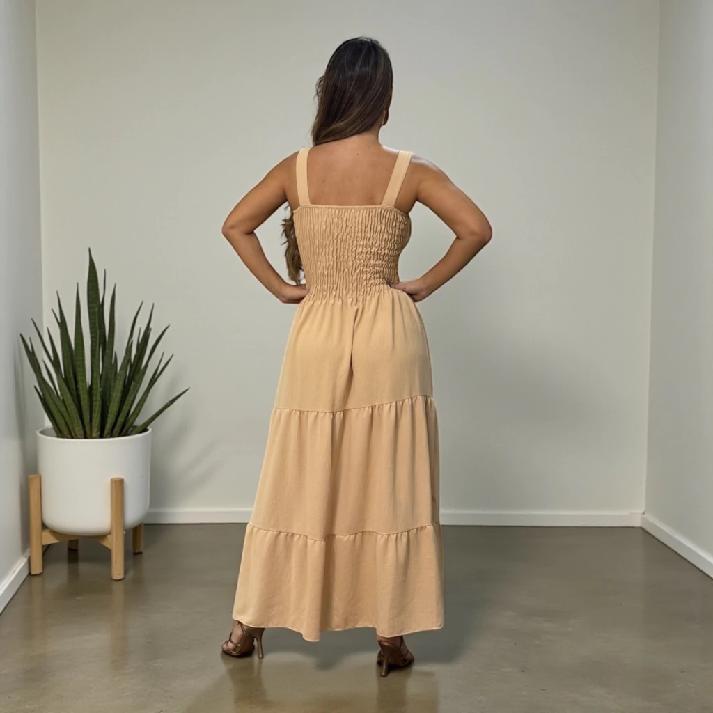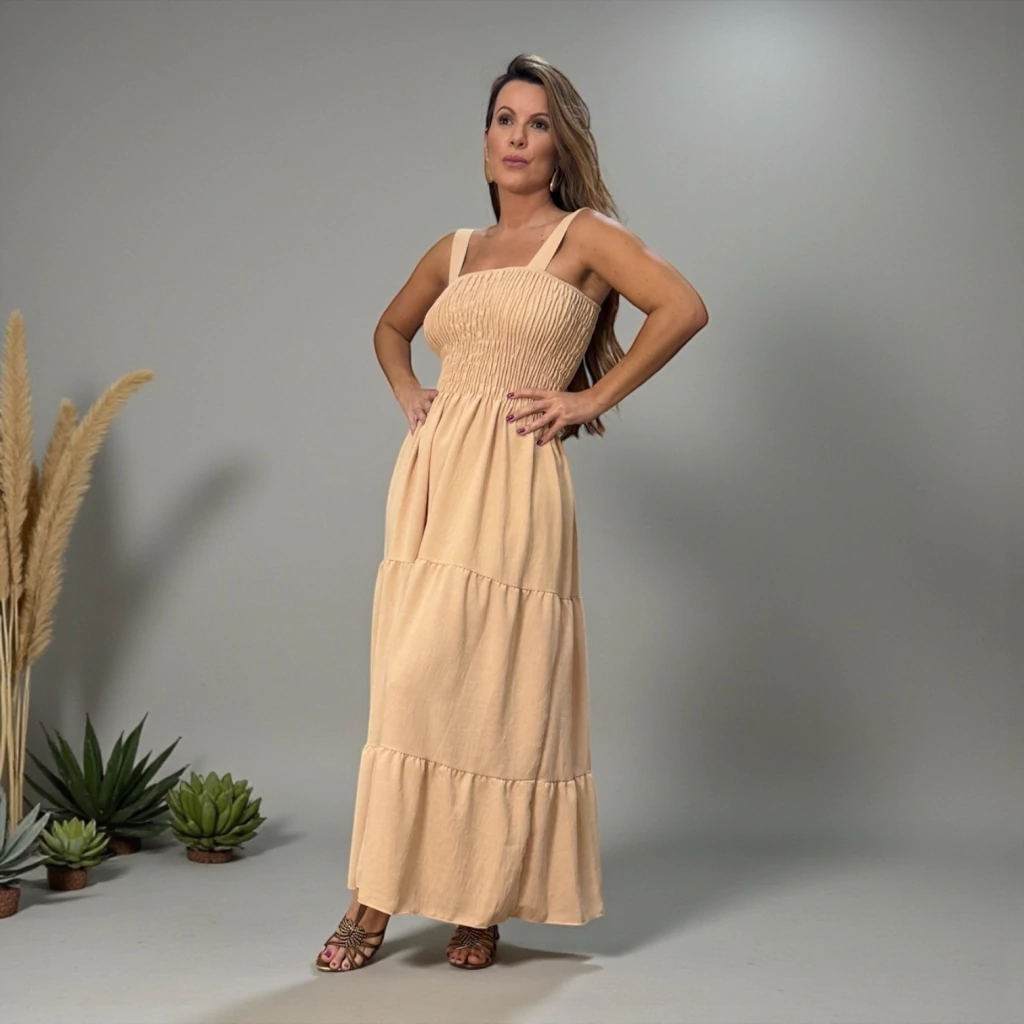 Vestido maxi midi em tecido duna, todo soltinho, com lastex no busto e alças largas que garantem conforto e excelente caimento.